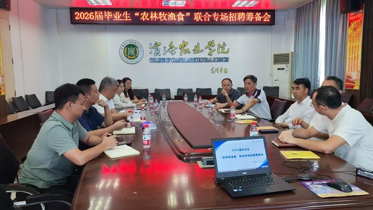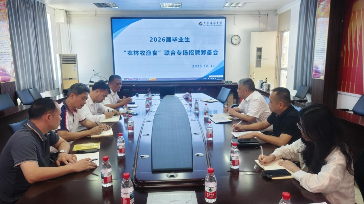 为深入贯彻高校毕业生就业工作部署,全力推动2026届毕业生更加充分、更高质量就业,10月11日下午,广东海洋大学在兴农楼419会议室召开2026届毕业生“农林牧渔食”联合专场招聘筹备会。水产学院党委副书记孔沛球、食品科技学院党委副书记罗智勇、滨海农业学院党委副书记王继全、学生工作部赵鸿洲科长以及各学院就业工作辅导员共同参会。
