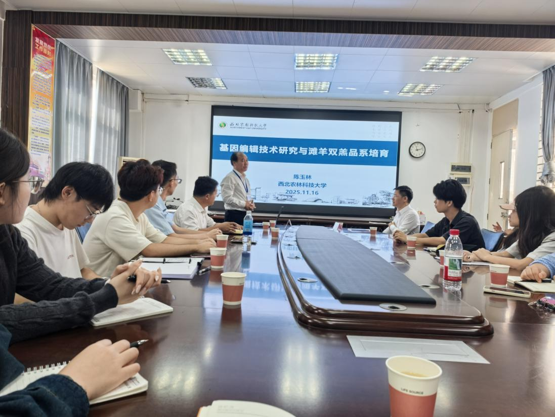 陈教授以《基因编辑技术研究与滩羊双羔品系培育》为题,系统阐述了基因编辑技术在畜牧业遗传改良中的应用进展,并重点分享了其团队在滩羊双羔品系培育中的突破性成果。针对传统滩羊繁殖率低的产业痛点,团队联合科研院校与企业,创新构建“选育点+专家团队+示范户”协同发展模式。通过应用多胎基因分型检测、基因组选择等前沿技术,团队成功培育出双羔滩羊新品系,为地方畜禽品种改良提供了可复制、可推广的实践路径。报告中,陈教授还深入解析了基因编辑技术在优化肉质、多羔性状、串子花等特征及多基因聚合育种中的应用前景,为畜禽育种从表型选育向精准育种转变提供了实践范本。会后,师生们就基因编辑技术应用规范、地方畜禽品种改良策略等议题,与陈教授进行深入交流,现场互动频频,学术氛围浓厚。