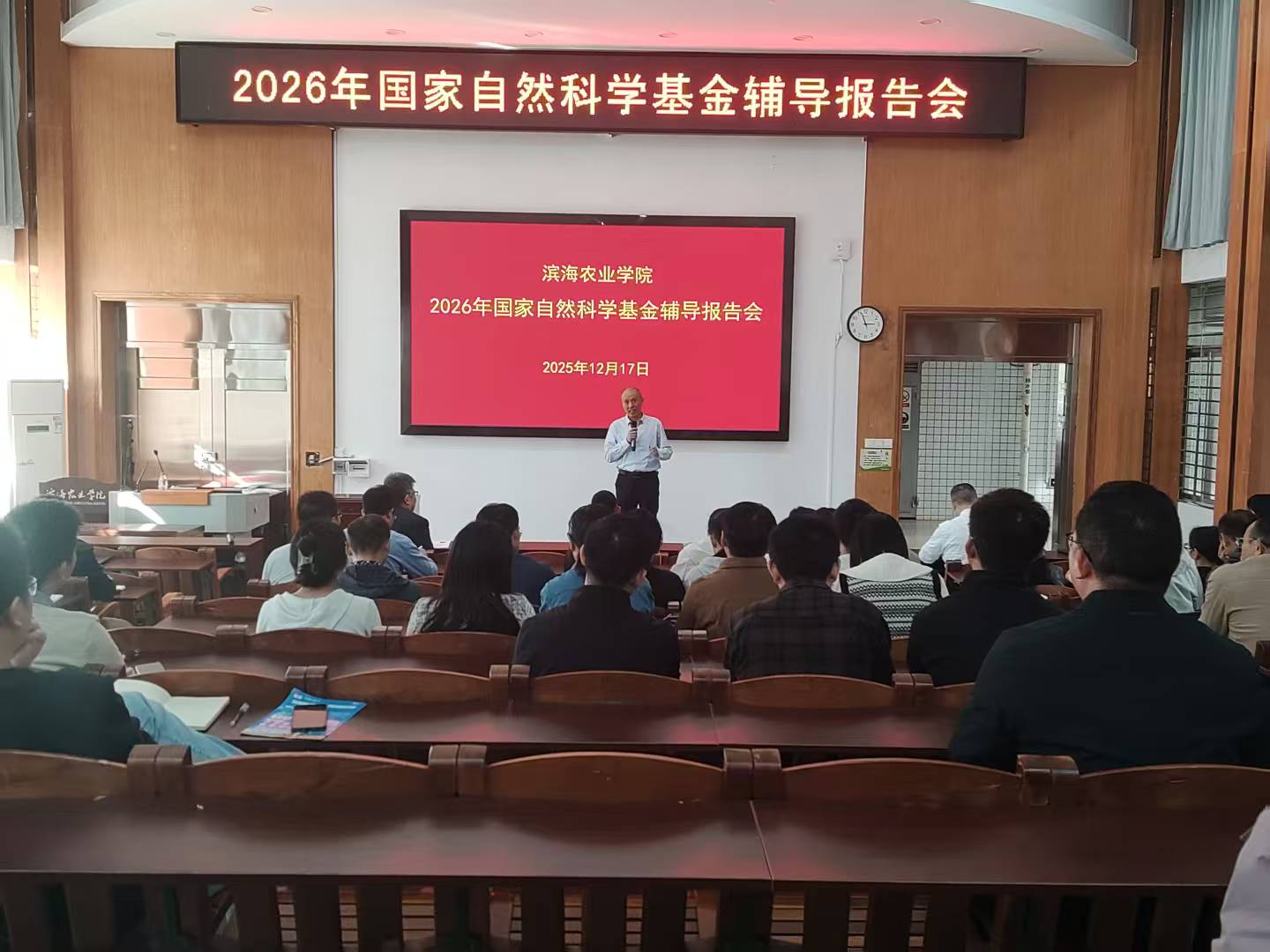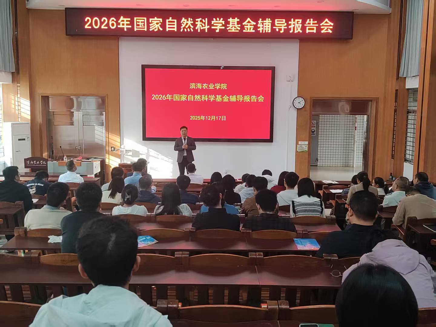 12月17日下午,滨海农业学院在湖光校区兴农楼109报告厅召开2026年度国家自然科学基金申报动员会。学校科学技术部部长颜云榕、学院党委书记郑殿峰、院长马驿、科学技术部项目管理科科长吴勇出席会议,学院教师及博士后代表等70余人参会。会议由副院长沈雪峰主持。