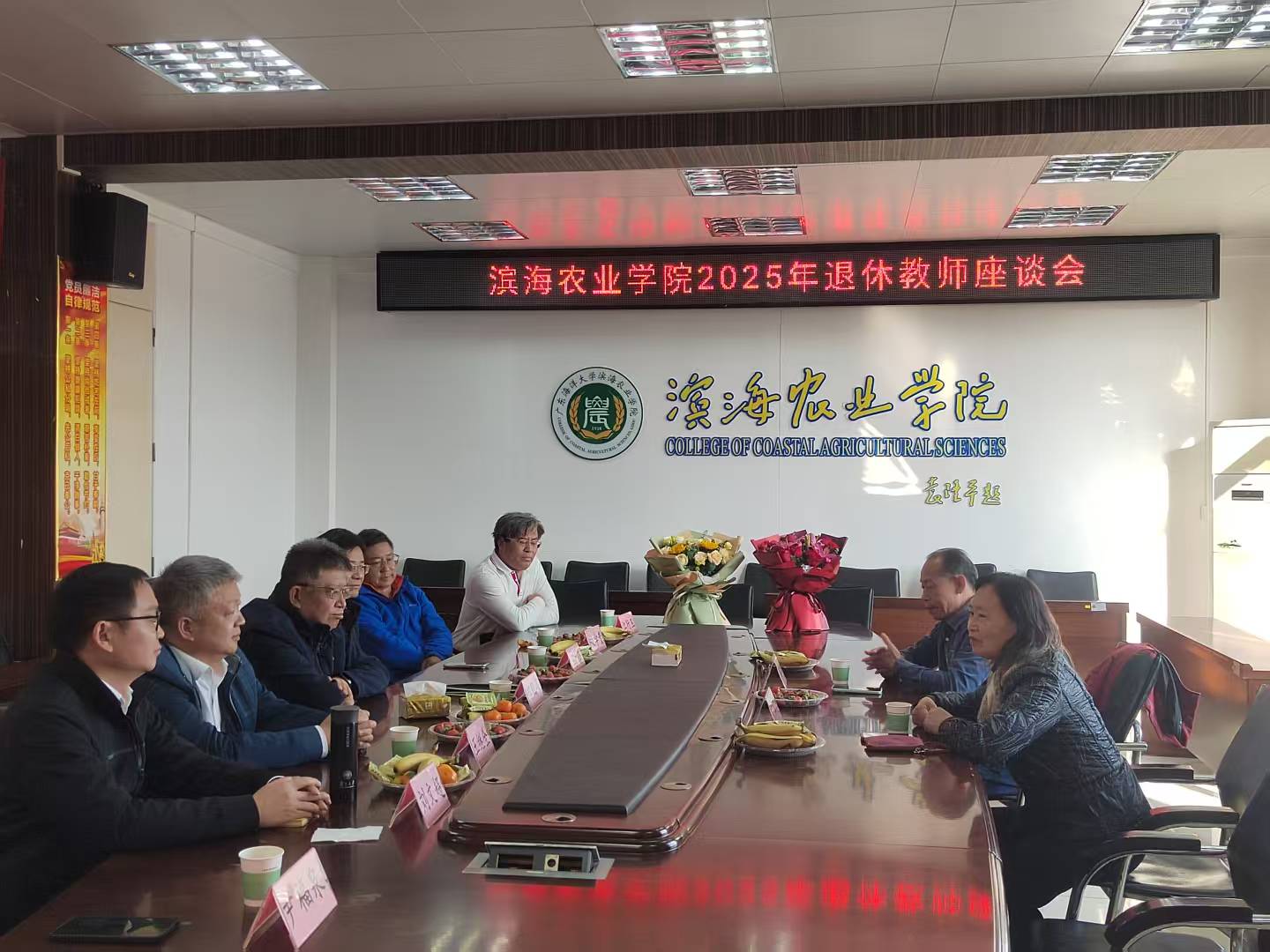 1月9日下午,滨海农业学院在兴农楼会议室召开2025年度退休教师座谈会,向本年度光荣退休的陈嘉文副书记、王润莲教授、效梅教授、刘月廉教授四位教职工表达崇高敬意与美好祝福。学院党委书记郑殿峰、院长马驿等领导班子成员、相关系主任与退休教师齐聚一堂,共忆执教生涯,畅谈学院发展。