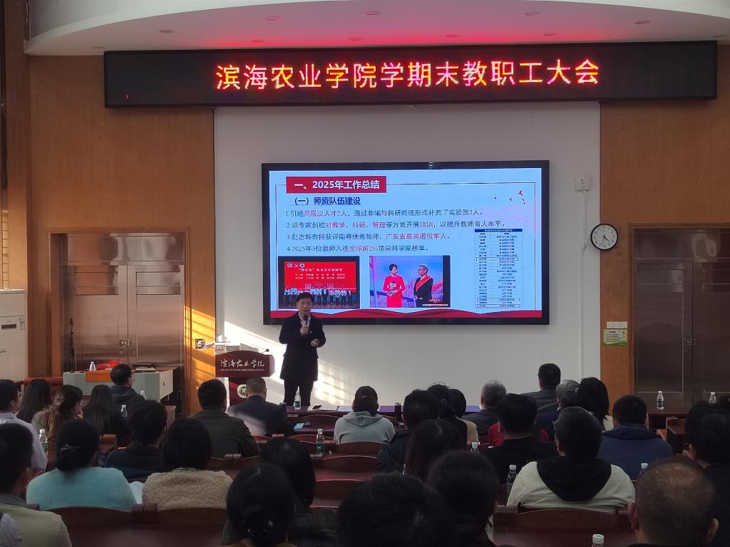 2026年1月12日下午,滨海农业学院在湖光校区兴农楼109教室召开全体教职工大会,深入学习贯彻党的二十届四中全会精神,并开展期末工作总结与领导干部述职。学院党委书记郑殿峰主持会议。