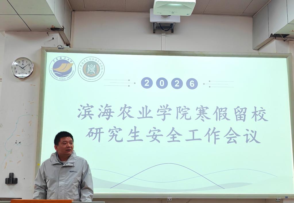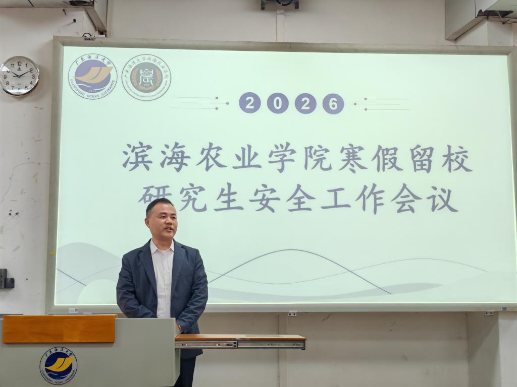 为切实筑牢寒假校园安全防线,保障留校研究生人身财产安全与学习生活秩序,1月17日,滨海农业学院在湖光校区广学楼230室召开2026年寒假留校研究生安全工作会议。学院副院长沈雪峰教授、辅导员肖为老师及约260名寒假留校研究生参会。会议由肖为老师主持。