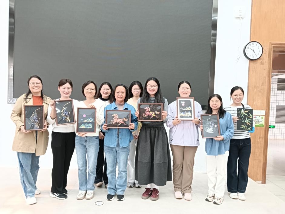 在随后的动手实践环节,女教工们全神贯注,将创意与匠心融入指尖。有的精心勾勒出“马到成功”的奔腾骏马,红色螺片熠熠生辉;有的以清新色调描绘“白色小猫”,灵动可爱;还有的用青绿螺片拼贴出“大好河山”,意境悠远;金紫色的“空谷幽兰”更显典雅脱俗。一幅幅独具匠心的螺钿作品,既展现了女教职工们的艺术创造力,也承载着对美好生活的向往与祝福。